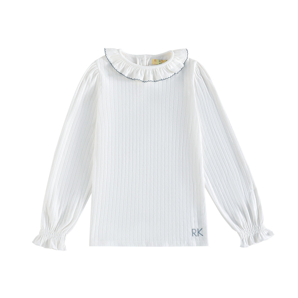 Retrokid Emery Pointelle Collared Long Sleeve White/ Light Blue Tshirt